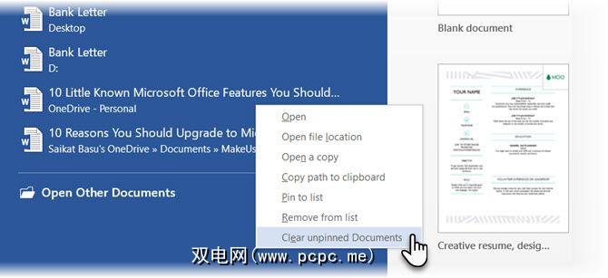 最新文档列表出现在屏幕的左侧。您可以删除所有最新打开文件的迹象,也可以完全禁用该列表,以便从现在开始不记录任何打开的文件。清除或禁用该列表还会从Word中的“打开"选项中删除所有文件名。