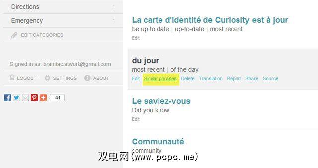 相似短语::这是一个链接,您将在保存的短语下面看到。单击它会显示其他类似的单词和短语(如果数据库中有其他单词和短语)。