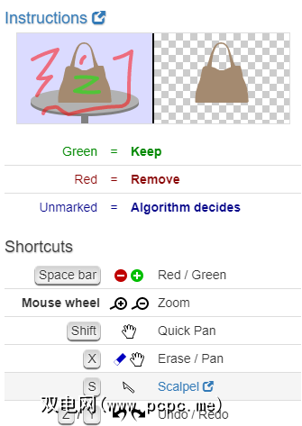 将图片上传几秒钟。完成后,您会看到一些有关如何使用该应用程序的快速说明。保留标记为绿色的所有内容,清除标记为红色的所有内容,保留标记为 unmarked 的所有内容,均由Clipping Magic算法确定。