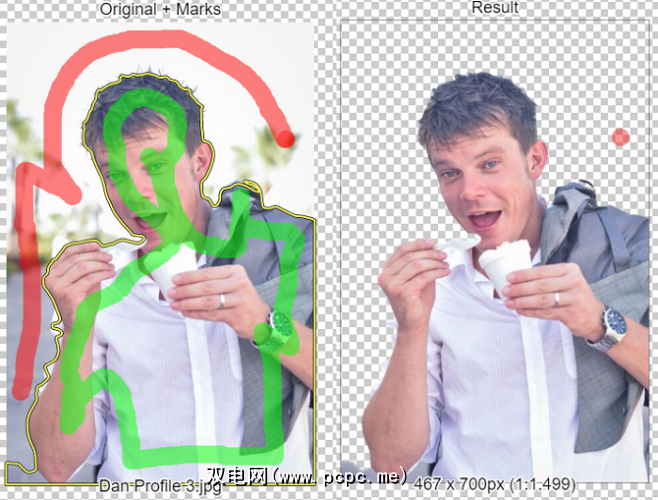 在示例中,您可以看到我正在从PCPC.me个人资料图片中删除背景。在左侧的图片中,我标记了要保留和删除的区域。右侧的图像是实时预览。