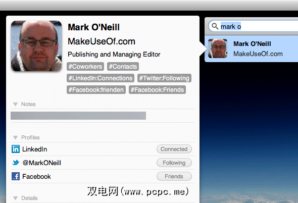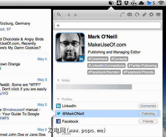 将鼠标悬停在该联系人上会打开一个新窗格,向您显示大部分(如果不是全部)该联系人信息。您可以在此处停止,也可以单击联系人以在中央窗格中打开该联系人。在这种模式下,您可以将鼠标悬停在这些链接上,从而显示联系人的Twitter提要或来自Facebook和LinkedIn的信息。