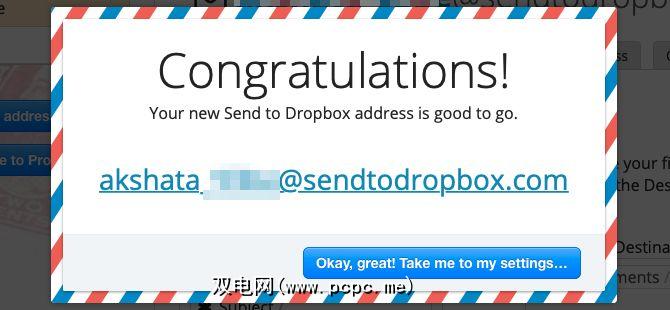 将服务与Dropbox帐户关联后,您将获得一个唯一的,可自定义的电子邮件地址。您(或与之共享电子邮件的人)发送到此地址的任何文件都会显示在专用的Dropbox文件夹中。