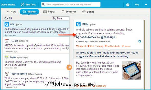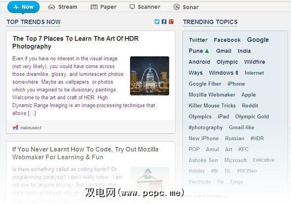 单击仪表板上的“现在",您可以快速将小麦与谷壳分开–浏览网络中流行的新闻。 Bottlenose还会获取趋势标签,您可以方便地单击它们以阅读周围的话题。