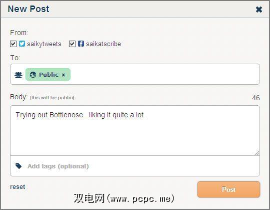 Bottlenose称之为“编写一次,在任何地方发布"的理念。您还可以发布超过140个字符的更新。 Bottlenose说– 如果您撰写的文章长度超过140个字符,那么如果您将其发布到Twitter,Bottlenose会自动将其缩短为140个字符,包括指向完整内容的bo.tt链接。您也可以在Bottlenose内发送电子邮件。