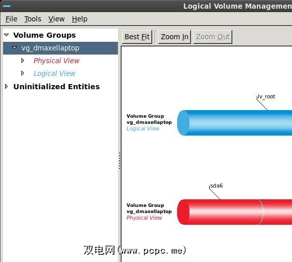 启动该工具时,与该屏幕截图类似的地方会打招呼,但是会有更多的空白。我的系统中已经存在LVM,因此每次打开它时都会看到一些图表。从这里,您可以转到左窗格并进入“ 未初始化的实体",然后选择要转换为LVM的分区。如果需要选择正确的哪一个的帮助,可以使用GParted或Palimpsest来帮助您。