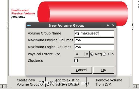 单击“ 初始化实体"并确认警告。完成后,您可以继续创建一个新的卷组。它为您提供了许多选项,但它们可以保持默认值。只需命名卷组,就可以完成。最好将“ vg _ "作为前缀,以在以后必要时帮助区分名称。您可以在其他硬盘驱动器上重复相同的过程,不同的是,您将其余硬盘添加到VG中,而不是每次都不创建新硬盘。