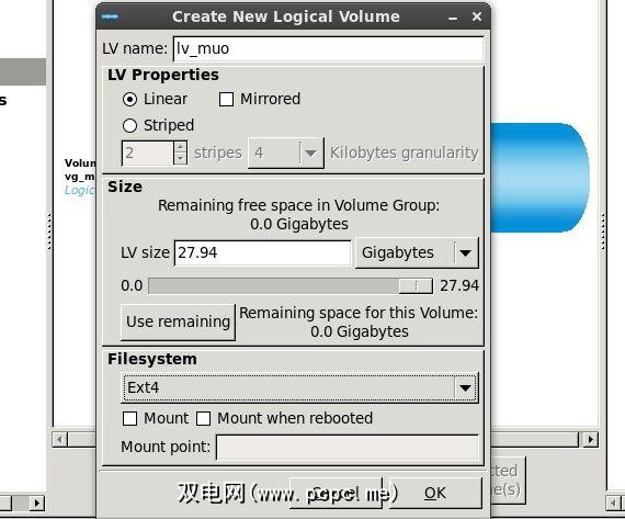 现在,您可以转到新的Volume分组并单击 Logical View 。除逻辑卷外,几乎所有内容都已设置。点击相应的按钮以执行此操作,您将看到另一个充满配置的窗口。您可以键入一个名称(最好使用“ lv _ "前缀),该名称应基于VG中的可用空间大小,应为哪个文件系统以及在何处挂载,以及该卷应跨两个硬盘驱动器进行镜像。请注意,如果硬盘驱动器的大小不同,则如果进行镜像,则逻辑卷的可用大小会变小。选择所需的参数,然后单击确定。