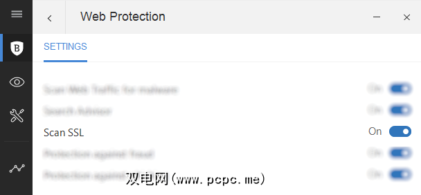 打开BitDefender,然后单击功能> Web保护>设置>扫描SSL 。 (在旧版本中,使用设置>隐私控制>防网络钓鱼,并禁用扫描SSL 。)