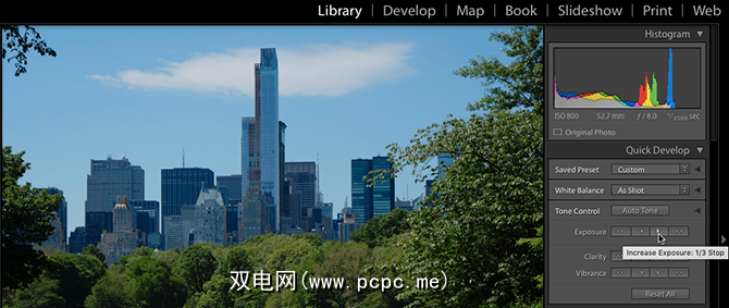 在Lightroom中,曝光滑块上的数字与光阑相对应。将滑块拖动到+1可使曝光量增加一档,相当于将光量增加一倍。