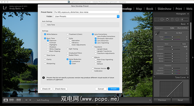 转到 Develop> New Preset 。输入描述性名称,然后取消选中 Lens Correction> Lens Distortion (镜头校正)之外的所有复选框。然后单击创建。