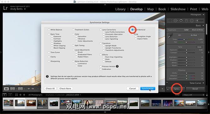 您可以将除尘校正复制到使用Lightroom中的同步功能的所有其他图像: