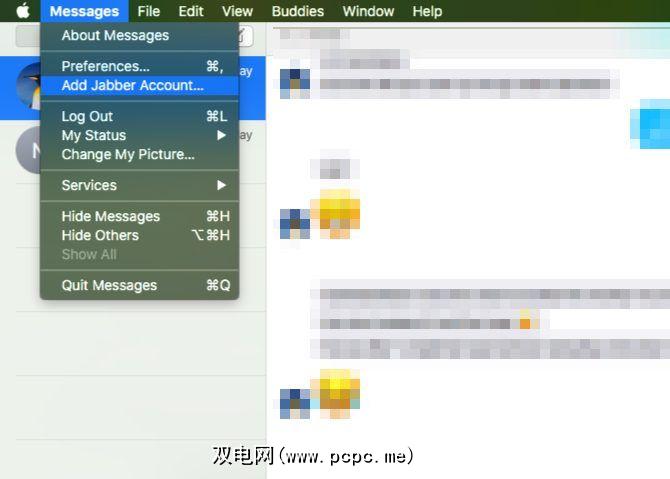 在High Sierra中,而不是添加帐户请参阅消息菜单中的添加Jabber帐户。单击该选项,然后在屏幕上使用您的Google凭据登录。如果环聊功能正常,则您的好友列表将立即显示在“消息"应用中。