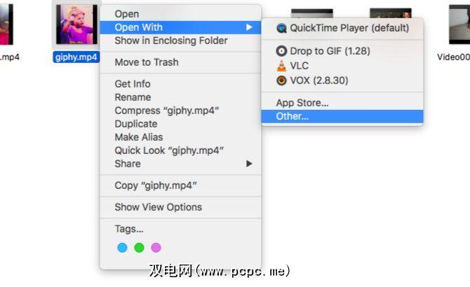 通过示例可以轻松完成此操作。假设您想将MP4文件设置为使用VLC Player而不是macOS默认的QuickTime Player打开。首先在Finder中打开任何 MP4文件的右键菜单,然后单击打开方式>其他... 选项。顺便说一下,该选项也出现在文件菜单中。