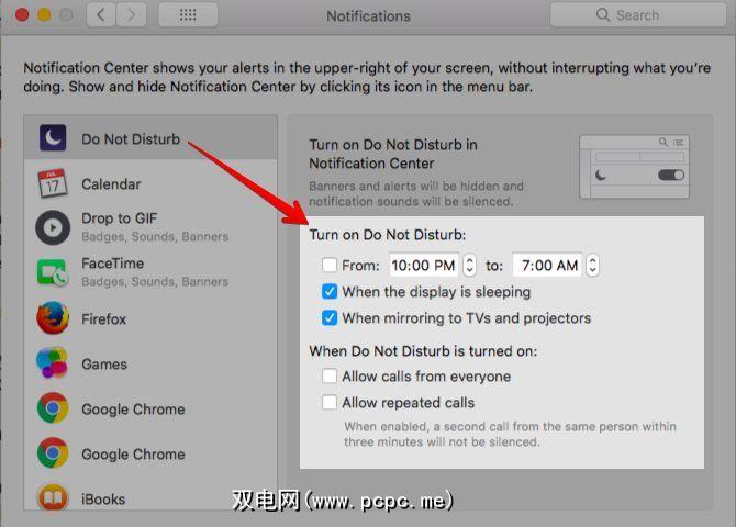 如果您在系统偏好设置>通知>请勿打扰下查看,则会找到自定义DND偏好设置的选项。
