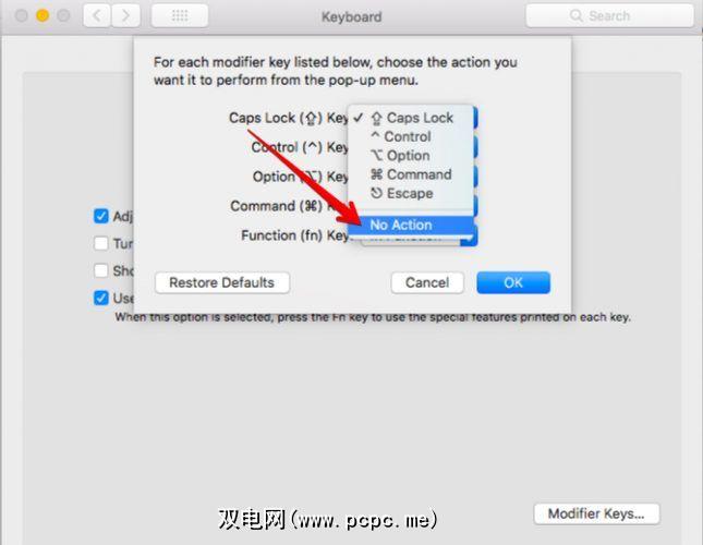 从大写锁定键旁边的下拉菜单中选择无操作,您就完成了!从菜单中的其他项目中,您会看到可以禁用它而不是禁用该键,而可以将其强制用作 Control , Option , Command 或 Escape 键。