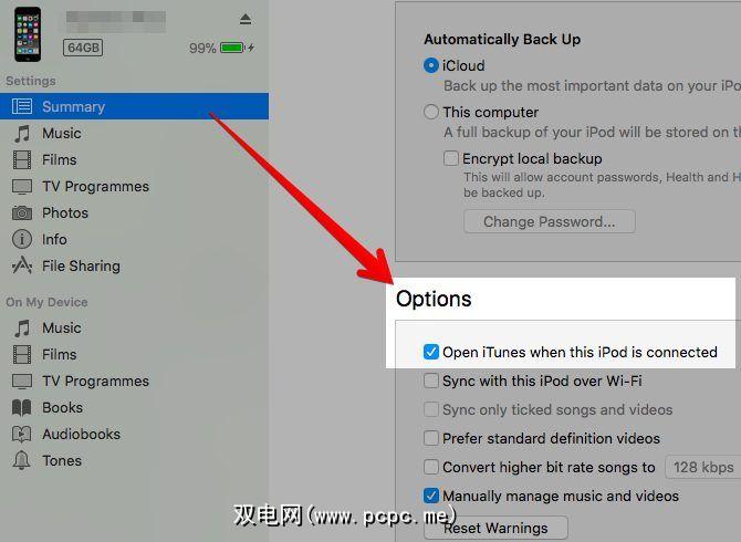 快速浏览一下侧边栏,以确保您位于iPhone设置的摘要部分。现在,向下滚动至右侧的选项部分,并选中在连接此iPod时打开iTunes 的框。请记住点击应用按钮以确认更改。问题就解决了!