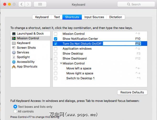 为什么不设置键盘快捷键来启用或禁用免打扰?您可以在系统偏好设置>键盘>快捷方式>任务控制下进行操作。选中打开/关闭请勿打扰复选框,然后在键输入字段中输入所需的热键(我使用 F12 )。
