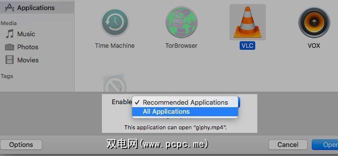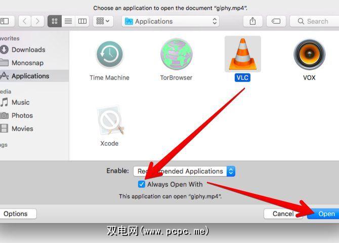 从弹出的Finder窗口中选择VLC播放器,选择始终打开方式复选框,然后点击打开按钮。做完了!现在,VLC是您用于打开MP4文件的新默认应用。