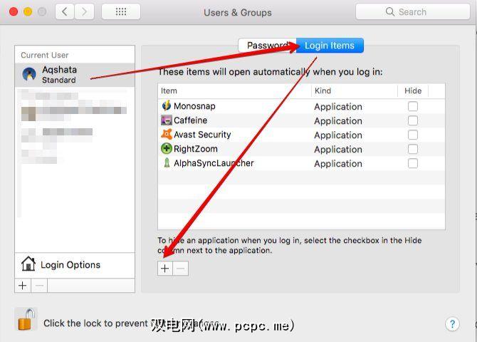 在侧边栏中的系统偏好设置>用户和组下选择您的用户名。接下来,切换到右侧相应面板中的登录项标签。那就是我们要寻找生命的清单。要在此处添加应用,请首先单击列表下方的“ + "图标。