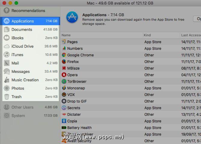 单击侧边栏上的一项,以查看各种应用程序,文件,文件夹,档案等占用了多少存储空间。进一步,使用侧边栏中建议后面隐藏的工具进行整理。