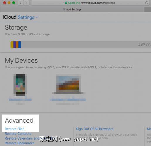如果无法从垃圾箱恢复已删除的iCloud Drive文件,下一步应该是在 iCloud.com>设置。如果单击高级部分下的还原文件链接,您将看到iCloud认为可恢复的文件列表(即在最近30天内删除的文件) )。