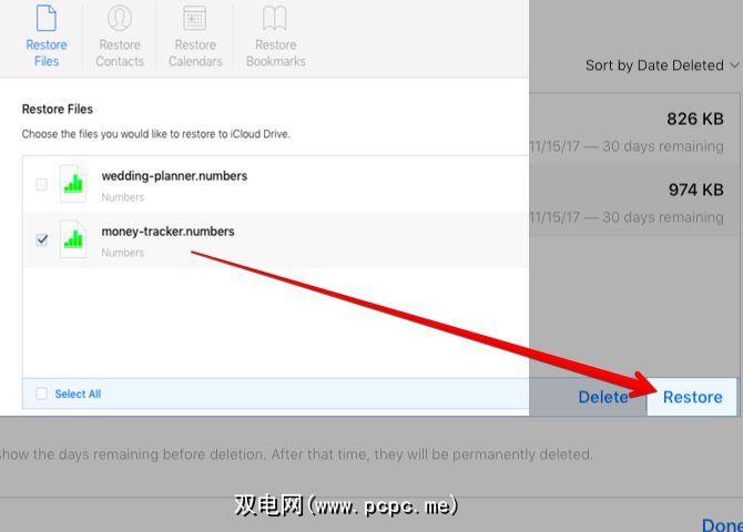选中要恢复文件的复选框,然后单击显示的还原链接。那应该会将您要查找的文件正确地放在Mac上iCloud Drive的正确文件夹中。