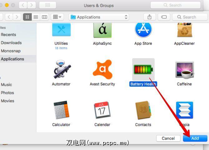 在打开的“查找器"窗口中,选择要在登录时打开的应用,然后点击添加按钮。现在,该应用程序应显示为设置为自动打开。