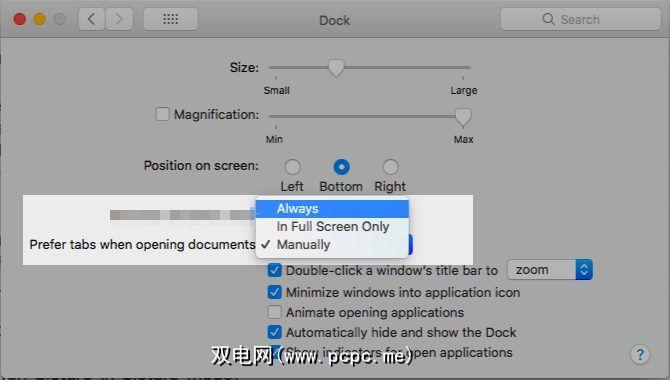 预览现在带有标签式界面。但是选项卡在哪里?在“预览"中打开文档时,您会注意到它们仍在单独的窗口中打开,而不是在选项卡中打开。要解决此问题,请转到系统偏好设置>坞站,然后从打开文档时首选选项卡下拉菜单中选择始终选项。