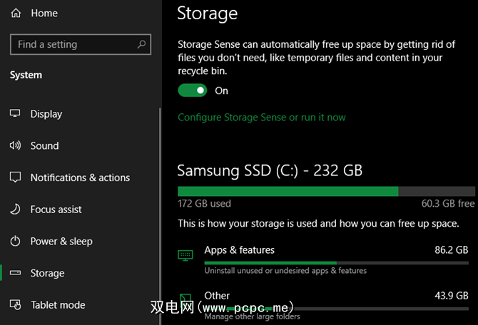您可以转到设置>系统>存储来打开Storage Sense,这是Windows 10的一项功能帮助您自动释放空间。有关其他选项,请在“开始"菜单中搜索磁盘清理。