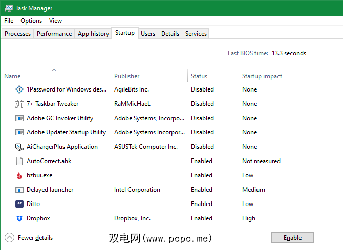 除了可以在每次启动时关闭程序,还可以禁用程序的运行完全在启动时。在Windows 10上,使用 Ctrl + Shift + Esc 打开任务管理器,如果只看到基本界面,则单击更多详细信息。从那里切换到启动标签,您将看到登录Windows时设置为运行的所有内容。