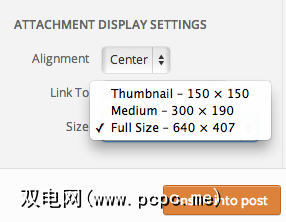 默认情况下,自定义图像尺寸不会显示在下拉框中将图片插入帖子时。您唯一会看到的是Thumbnail,Medium,Large和Full Size(取决于原始图像的大小,因为它不会被放大)。
