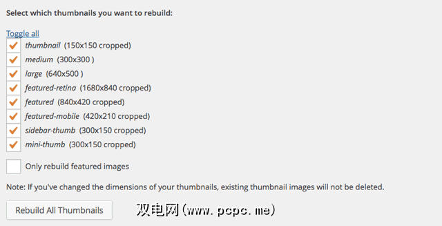 如前所述,如果您有很多图片尺寸,则会生成很多图片。值得庆幸的是,通过缩略图重建,您可以将其限制为仅特色图片。但是同样,请记住,这仅适用于您以前的图像。将来所有上传的图像都将由WordPress管理,这意味着将为所有内容创建所有图像大小。
