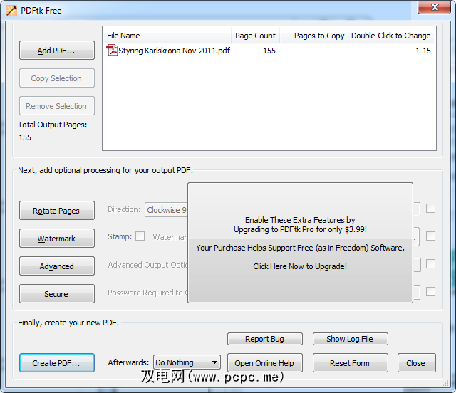PDFtk会鼓励您购买付费版本,但您不需要它。要使用PDFtk,请打开它并使用“添加PDF"按钮添加PDF文件。双击右列,然后输入要用于新文件的页面范围。例如,如果您有一个13页的PDF文件,而只需要4-9页,则可以在该栏中输入4-9。如果您只想要第2、8和11页,则在该列中输入2,8,11。所有这些都在PDFtk窗口的顶部进行了说明。