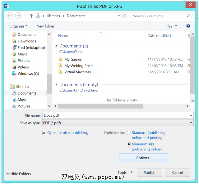 要将文档导出为Office 2013中的PDF,请单击“文件"菜单,选择“导出",然后单击“创建PDF / XPS"。在“保存"对话框中,选择“优化"设置-“标准"(在线发布和打印)或“最小尺寸"(在线发布)。如果您不希望打印文档,并且希望文档尽可能小,请选择最小设置。这将使用有损压缩来缩小PDF文件的大小。
