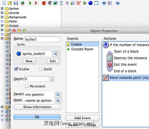 这个想法很简单。您在游戏中添加了许多元素,包括背景,声音和对象。这些对象在游戏中的行为可以通过指定事件和伴随的动作来编写脚本。考虑上面的截图。在事件“创建"(即初始化)上,对象将通过右侧列中概述的操作运行。这些动作可以嵌套,并包括条件(如果为“ this",则执行“ that")和控制流语句(而“ this",则为“ that")。