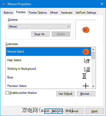 此列表列出了系统使用的所有不同游标,例如 Normal Select 或 Busy >。单击您要更改的光标,然后单击浏览…以导航到您下载的光标。 双击选中它。