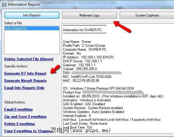 单击左侧的“报告"链接,将打开一个新的“信息报告"窗口,您可以在其中收集D7对整个计算机系统进行完全详细的轮询,创建基于文本的报告,您可以打印或通过电子邮件发送给自己。 D7还可以找到常用恶意软件程序的恶意软件日志,并让您获取所看到的任何错误消息的屏幕截图。
