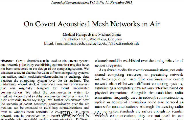 2013年,德国弗劳恩霍夫通信,信息处理和人体工程学研究所的研究人员进行了一项研究。研究发现,“隐蔽的声学网络"(一种曾经被假设但从未得到证明的技术)确实是可能的。