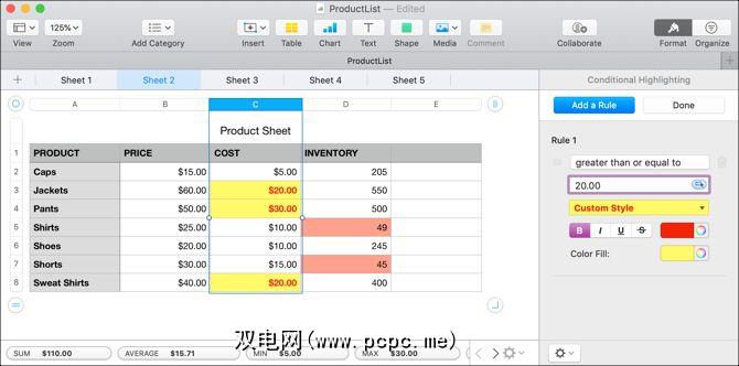 在下面的示例中,对于所有项目成本为20美元或更高的项目,我们的单元格都使用黄色突出显示和红色文本进行了格式化,