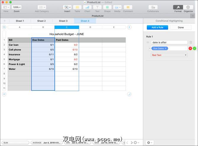 使用条件格式设置日期的最佳方法之一就是让账单的到期日脱颖而出。因此,这是我们的下一个示例。我们将为所有截止日期之后的付费日期设置一条规则,以红色文本显示。