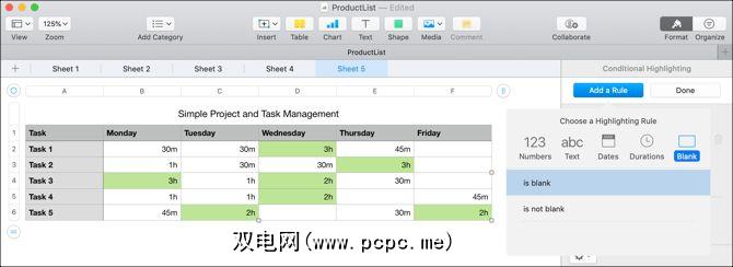 为向您展示如何设置此规则,我们将使用项目管理电子表格并提供所有空白持续时间均显示为蓝色。