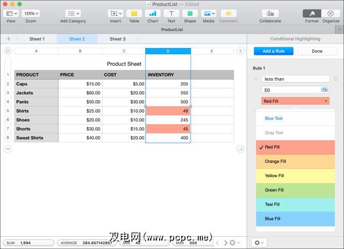 在Numbers中设置的另一种方便的突出显示规则是用于空白单元格。您可以在上面的每个示例中使用它,例如缺少库存数量,学生成绩和账单日期。
