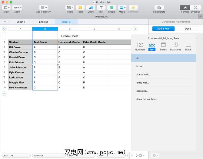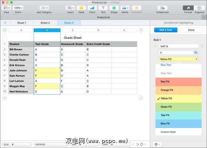 文本是电子表格中另一种广泛使用的数据类型。对于使用数字来跟踪学生成绩的老师或教授,有条件的突出显示非常方便。