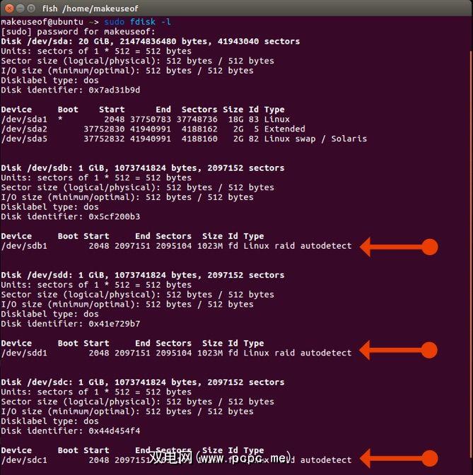 在我们的示例中,为简单起见,我们将使用三个1GB驱动器(实际上,这些将会更大)。使用以下终端命令检查哪些磁盘已连接到系统: