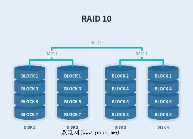 RAID 10基本上是RAID 1 +0。这是这些级别的组合。您将需要成对磁盘才能实现此目的。数据在两个磁盘之间进行条带化,然后将其镜像到另一组磁盘上。您将从RAID 0获得性能优势,并从RAID 1获得冗余。