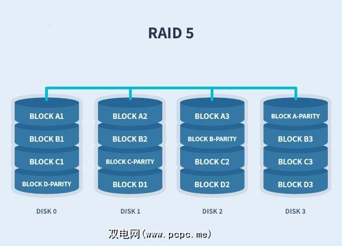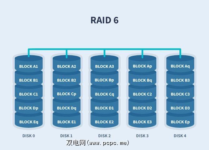 RAID 5和6将提供性能和冗余。数据与奇偶校验信息一起分布在驱动器上。 RAID 5总共使用一个驱动器的奇偶校验值,而RAID 6使用两个。如果数据不再可用,则使用奇偶校验数据,计算机可以重新计算其他数据块之一的数据。这意味着RAID 5可能会丢失单个驱动器,而RAID 6可能会在任何单个时间点使两个驱动器发生故障。