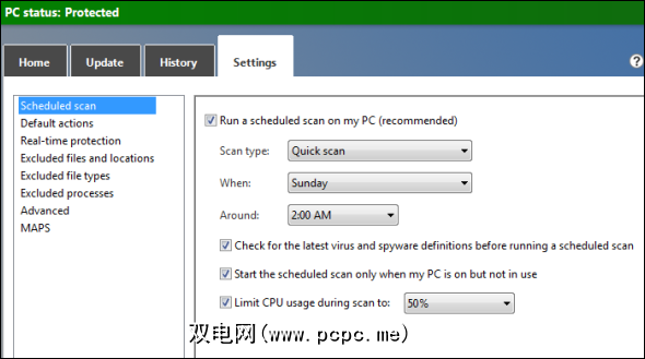 您通常可以从防病毒应用程序中选择计划的扫描时间。例如,您可以在Microsoft Security Essentials(或Windows 8上的Windows Defender)的设置选项卡上的计划扫描下找到这些选项。
