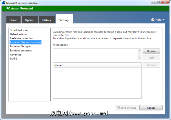 此选项通常位于同一位置作为防病毒程序中的 Exclusions 设置。如果您没有看到这些选项,则您的防病毒软件可能没有此功能(Microsoft Security Essentials默认未启用此功能)。