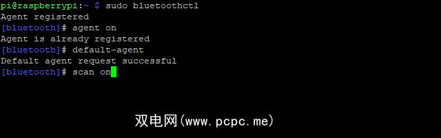 sudo bluetoothctl您应该看到响应“代理已注册"和新的提示 [Bluetooth]#。在提示符下,按如下所示启用代理: