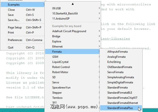 连接好后,上传 StandardFirmataPlus 示例草图。您可以在示例>固件> StandardFirmataPlus 下的文件菜单中找到此草图。您根本不需要修改草图,它实际上只是将Arduino设置为等待外部指令,稍后我们将为您提供这些指令。